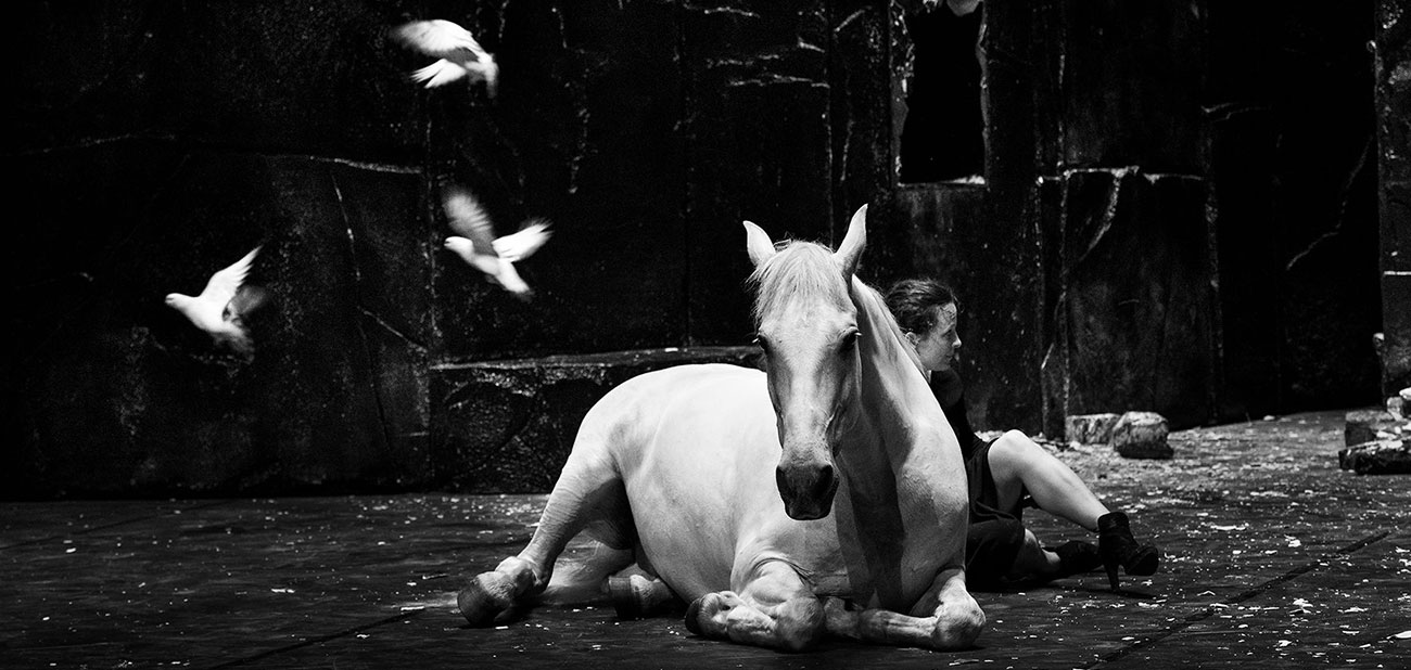 Em palco Noëmie Bouissou, Camille Decourtye, Claire Lamothe, Blaï Mateu Trias, Oriol Pla, Julian Sicard, Marti Soler, Guillermo Weickert, um cavalo e pombos