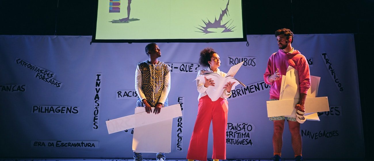 descobri-quê? é um espetáculo que pretende contribuir para a descolonização – enquanto gesto inacabado, portanto constante e continuado – do ensino do período histórico designado como descobrimentos, quebrando uma série de narrativas oficiais que romantizam esta época e procurando uma confrontação com o passado invasor, expansionista e colonialista português.