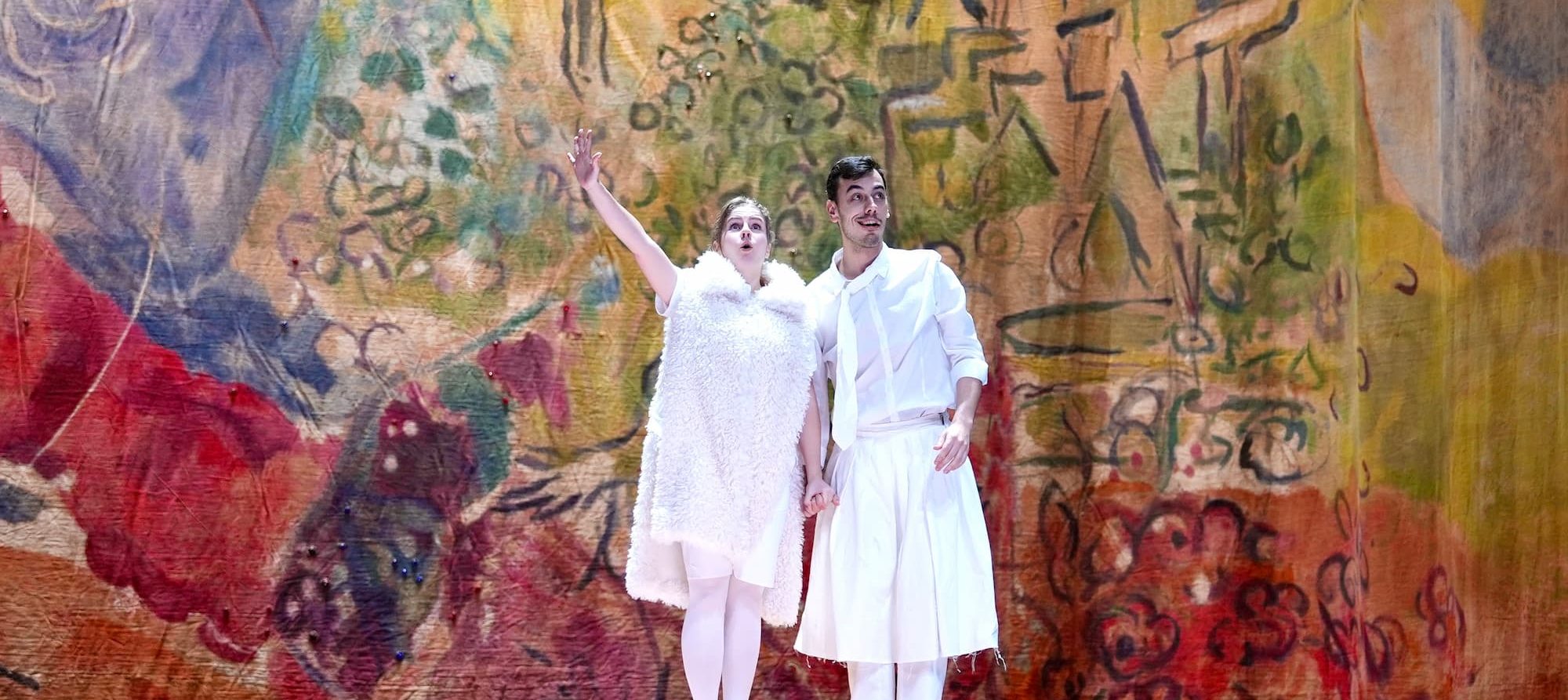 Assistimos a um espetáculo que sugere um ensaio da ópera A Flauta Mágica, de Mozart, com texto original de Gonçalo M. Tavares e encenação de Jean Paul Bucchieri. Uma figura, interpretada por Miguel Loureiro, vai falando com os cantores, contando histórias. Sobre música, sobre pintura, sobre a sua vida. A vida não é simples, mas na vida não se pode repetir, nem ensaiar. O pano de Chagall está no fundo, há vestígios dele. Fala-se de uma exposição temporária do pano de Chagall, um acontecimento. É um espetáculo no qual se recria um ensaio da ópera A Flauta Mágica e é uma exposição temporária. Os cantores lembram a flauta que salva e resolve, mas a figura que anda no palco sabe que na vida real as coisas não são assim. Nada resolve, nem salva.