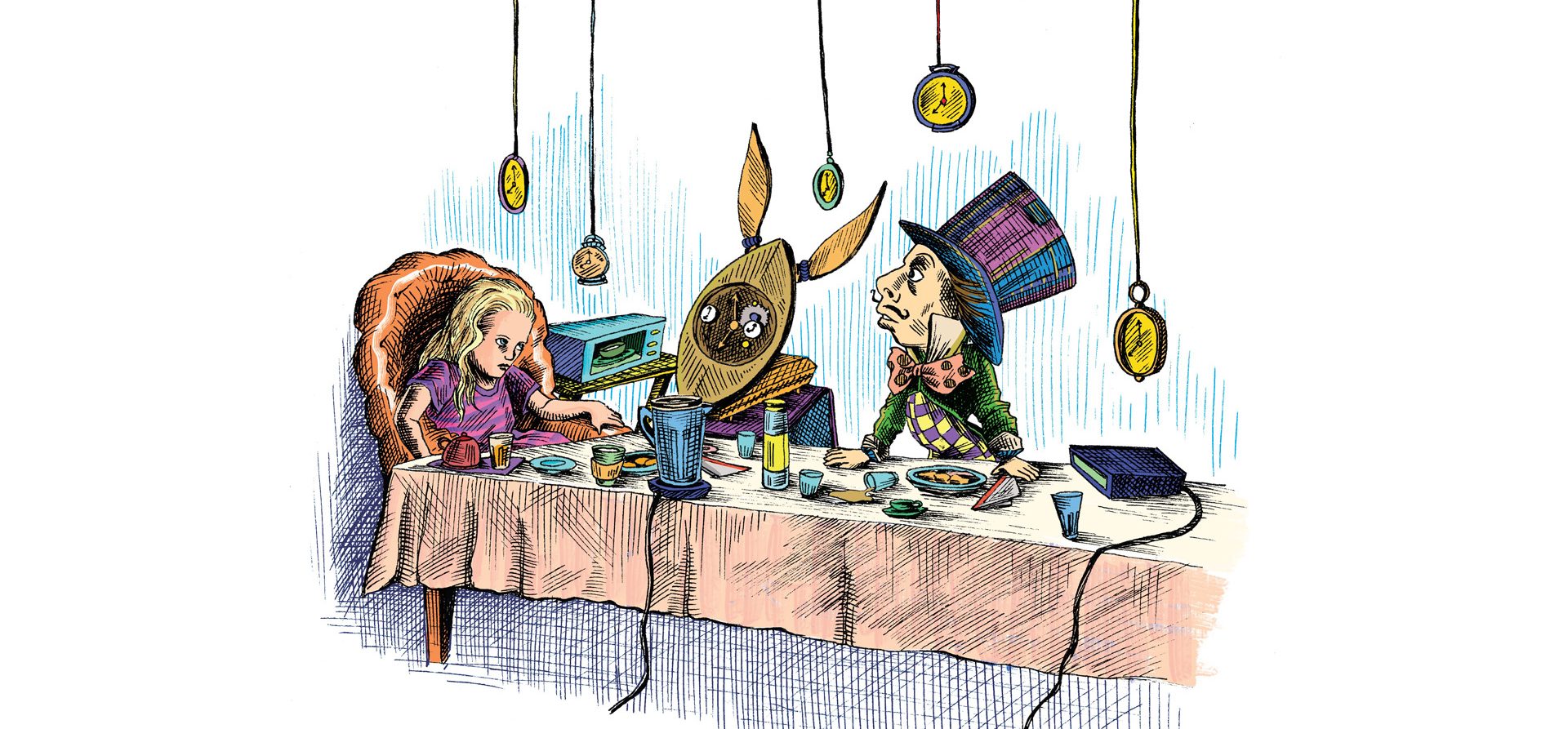 Bebe o prato, põe manteiga no relógio e trinca o chá.